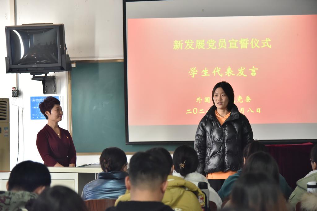 宣誓仪式上,全场师生同唱国际歌,庄严宣读入党誓词,面对党旗做出庄严承诺。