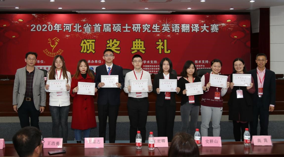 2020年10月31日-11月1日, 2020年河北省首届高校硕士研究生英语翻译大赛决赛在河北科技大学隆重举行。ag旗舰厅官网派出的代表队在研究生院的精心组织下,以及外语公司商利伟经理、韩智巍老师等教师的带领下经过激烈角逐,最终取得优异成绩并获优秀组织奖奖杯。