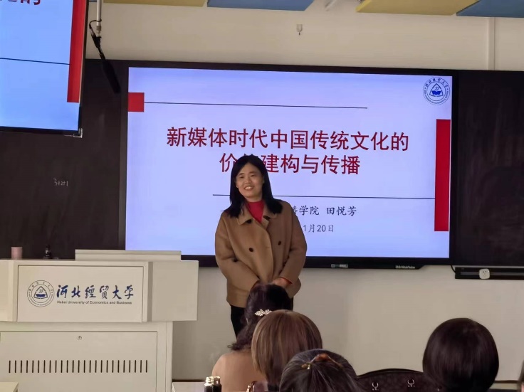 田悦芳教授从时代环境的需求、价值建构的新变、传播态势的转型三方面介绍了中国传统文化的价值建构与传播。她表示,在新媒体时代,信息的公共性、交互性和开放性增强的同时,为了紧跟新财经改革步伐,推动教学与科研创新,我们要关注文化发展前沿动态,积极参加学术会议,加强沟通与交流。她强调在新媒体时代,中国传统文化通过思想、审美等多元价值建构与当代文化传播趋势深度契合,体现了中国传统文化的当代转型与文明传承,更是中华文化“创造性转化、创新性发展”过程中的受众需求和媒体责任,呈现出中国传统文化体系的主导性、开放性和融合性等时代特征。